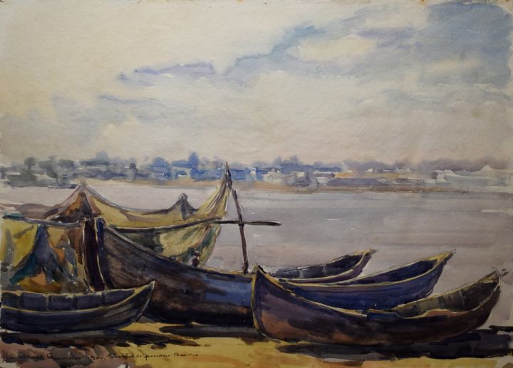 „Punctul pescăresc Brăila (Bărcile în repaus)” | 1960 | acuarelă.