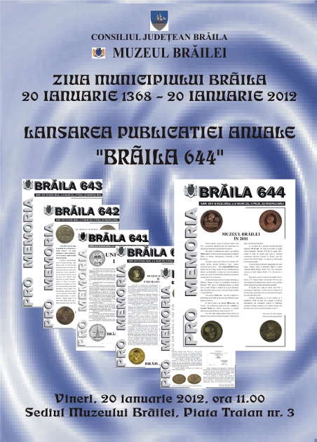 Cu ocazia împlinirii a 644 de ani de la atestarea documentară a municipiului Brăila (20 ianuarie 1368 - 20 ianuarie 2012), Muzeul Brăilei vă invită vineri, 20 ianuarie 2012, ora 11.00, la sediul Muzeului Brăilei (Piaţa Traian 3), să participaţi la manifestările organizate cu acest prilej.