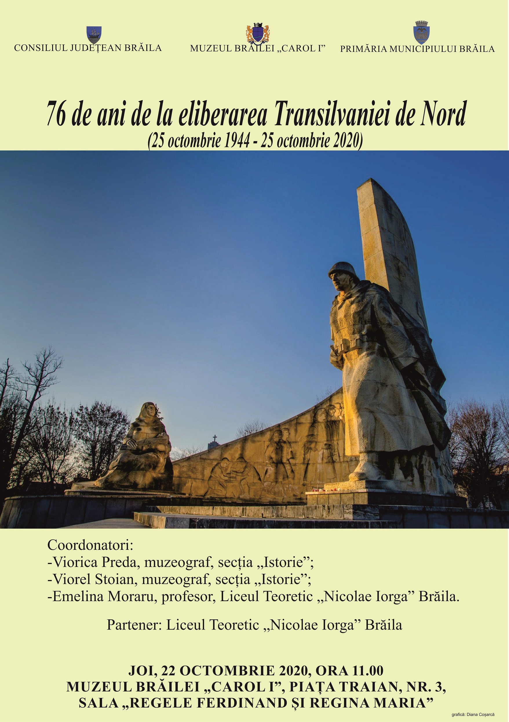 Activitatea cu tema „76 de ani de la eliberarea Transilvaniei de Nord (25 octombrie 1944 - 25 octombrie 2020)", dedicată Zilei Armatei Române, va avea loc joi, 22 octombrie 2020, ora 11.00, la sediul Muzeului Brăilei „Carol I”, sala „Regele Ferdinand și Regina Maria” (Piața Traian, nr. 3)