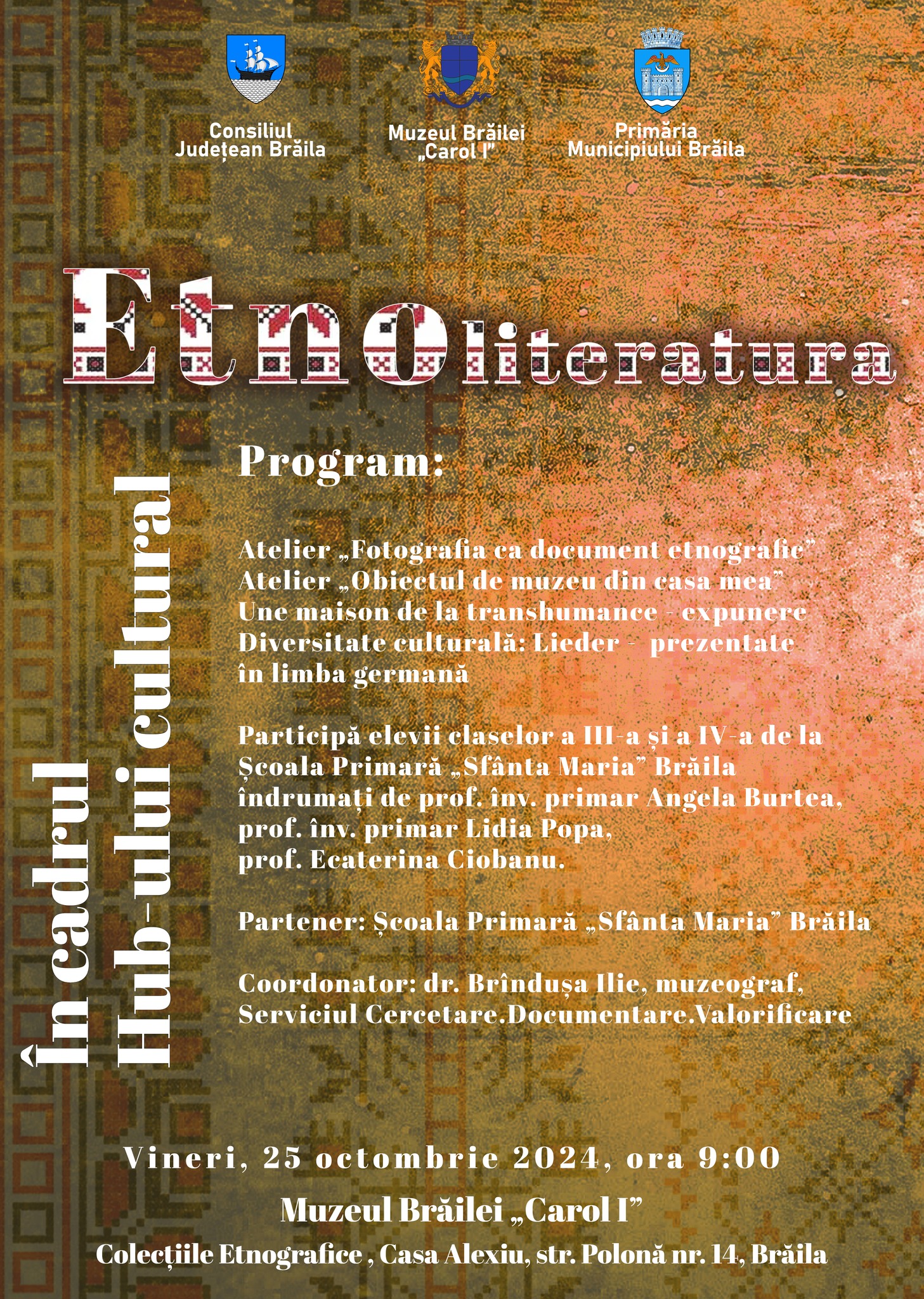 Vineri, 25 octombrie, ora 9.00, se va desfășura o nouă activitate în cadrul Hub-ului cultural „Etnoliteratura”, Casa Alexiu/Colecțiile Etnografice ale Muzeului Brăilei „Carol I”.