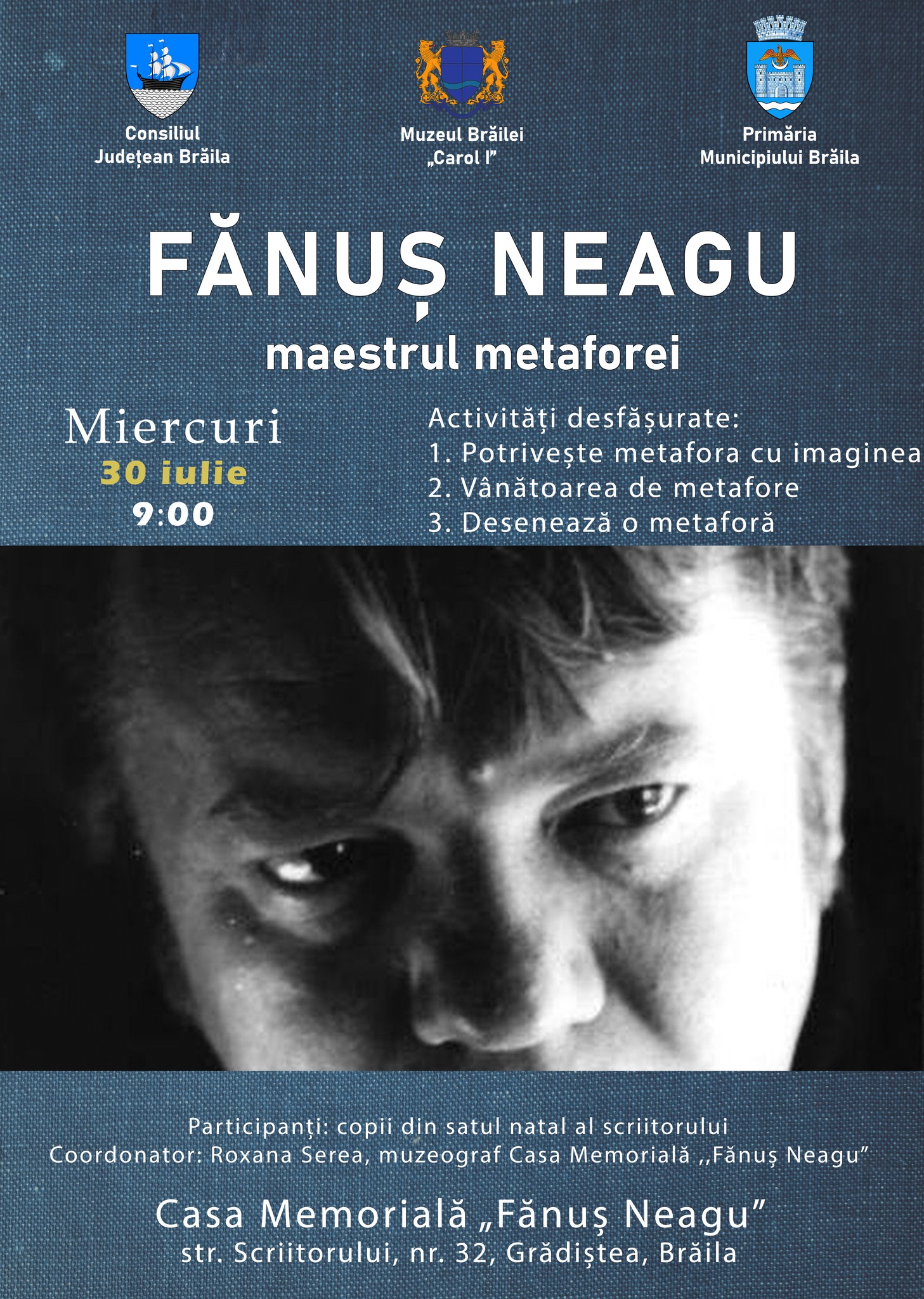 Muzeul Brăilei „Carol I” - Casa Memorială „Fănuș Neagu” (Com. Grădiștea, jud. Brăila) organizeză miercuri, 30 iulie 2025, începând cu ora 9:00, activitatea cu tema „Fănuș Neagu, maestrul metaforei”.