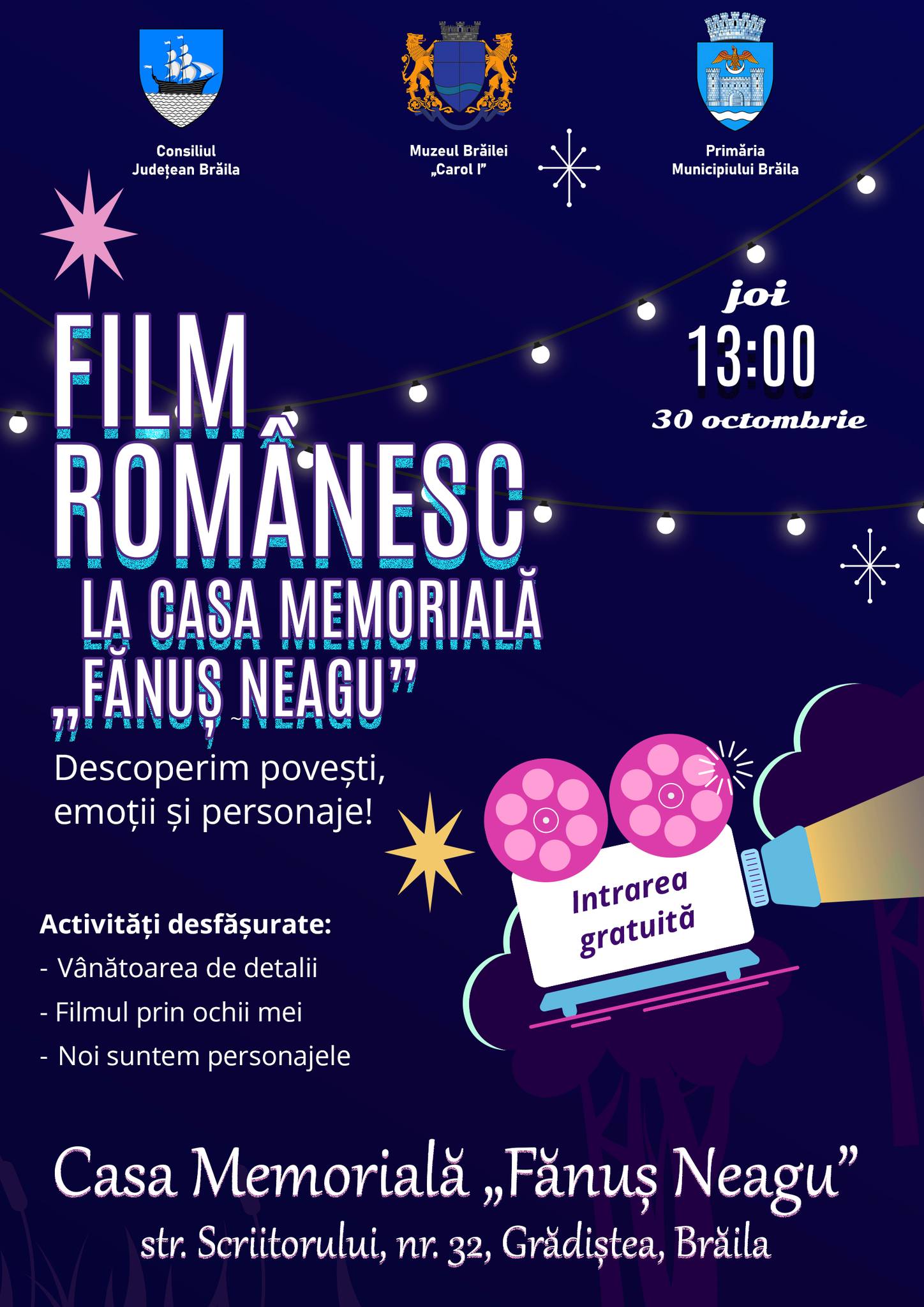 Muzeul Brăilei „Carol I”- Casa Memorială ,,Fănuș Neagu", organizează joi, 30 octombrie 2025, activitatea „Film românesc la Casa Memorială „Fănuș Neagu” - Descoperim povești, emoții și personaje!”