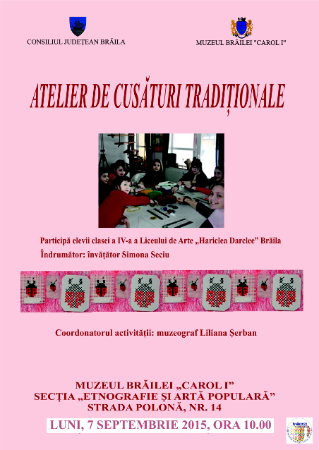 Secția „Etnografie și Artă Populară” a Muzeului Brăilei „Carol I” (strada Polonă, nr. 14) a organizat, în colaborare cu Liceul de Arte „Hariclea Darcleé” Brăila, un Atelier de cusături tradiționale - luni, 7 septembrie 2015, ora 10.