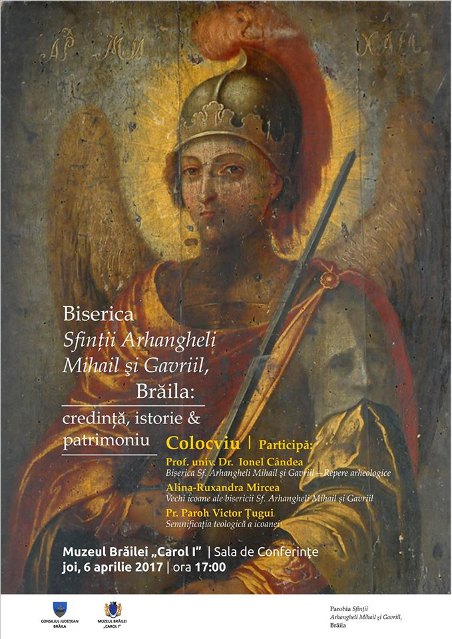 Colocviul „Biserica Sfinţii Arhangheli Mihail Şi Gavriil, Brăila: Credinţă, Istorie, Patrimoniu" are loc joi, 6 aprilie 2017, ora 17.00, la sediul Muzeului Brăilei „Carol I" (Piaţa Traian nr. 3).