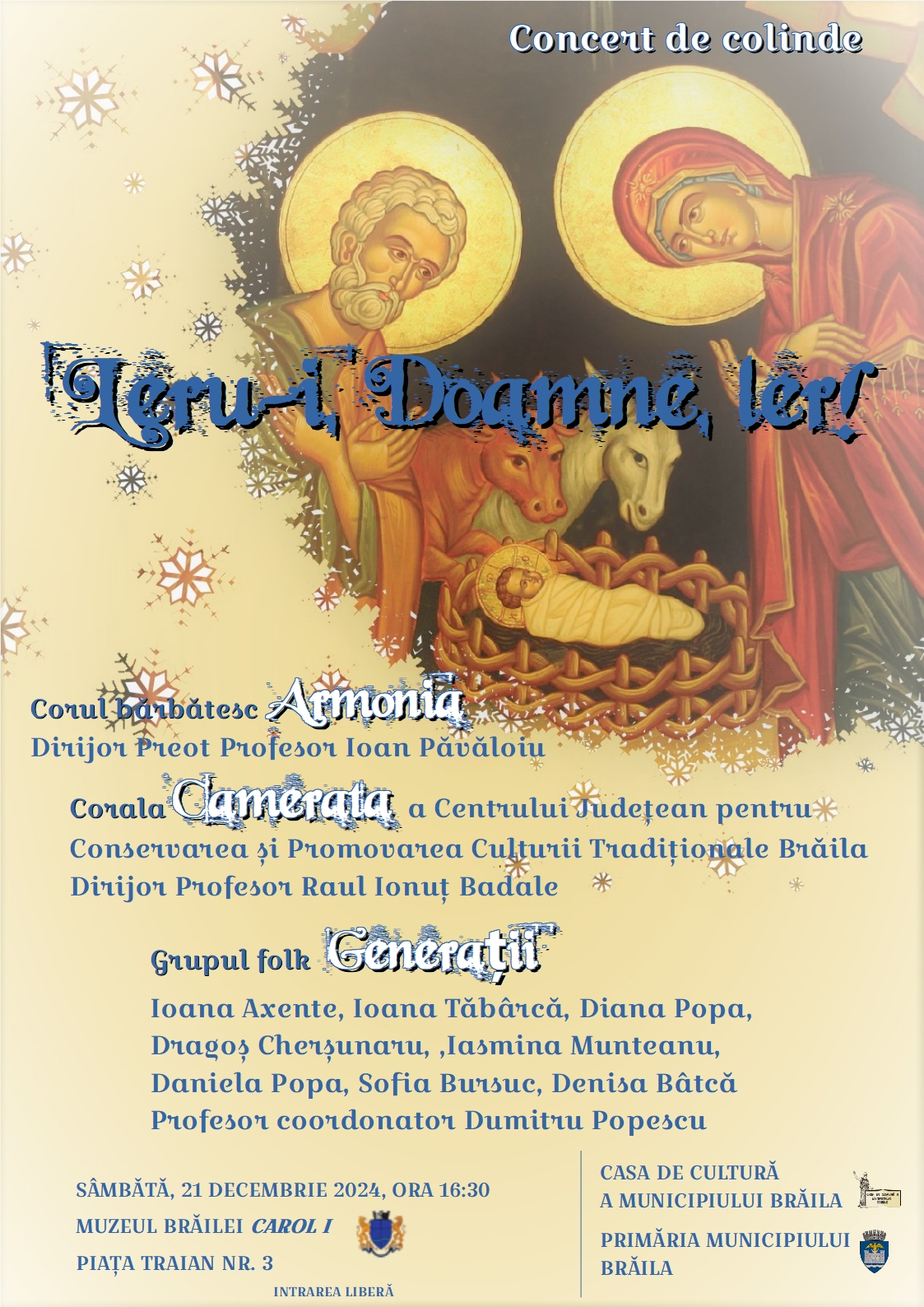 În așteptarea luminosului praznic al Naşterii Domnului, Casa de Cultură a Municipiului Brăila vă invită la sediul Muzeului Brăilei „Carol I", Sala „Regele Ferdinand și Regina Maria", sâmbătă, 21 decembrie 2024, de la ora 16.30, să urmăriți tradiționalul Concert de Crăciun.
