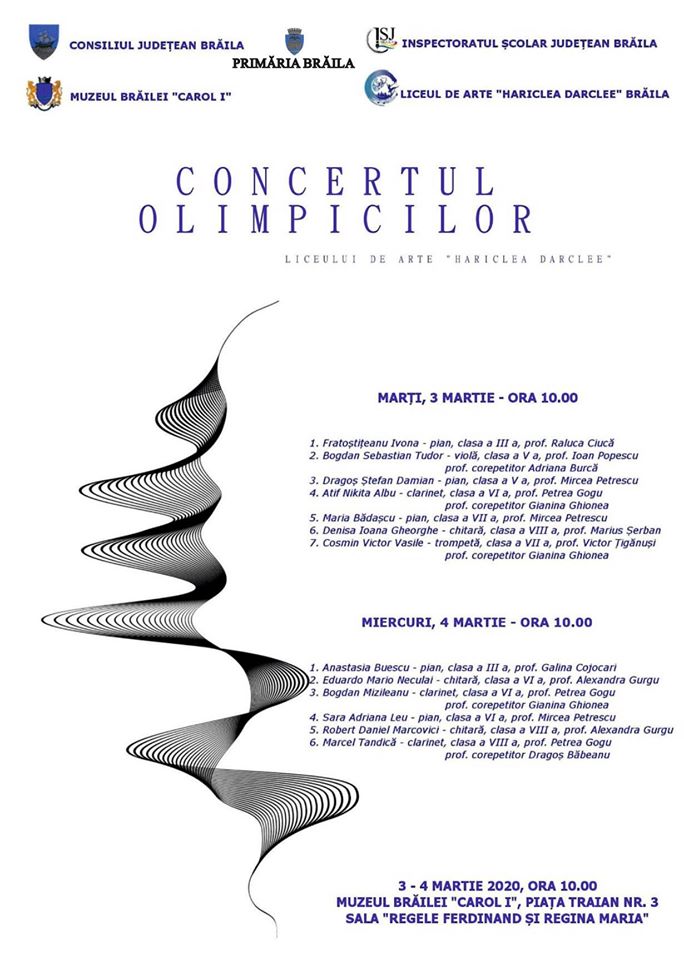 CONCERTUL OLIMPICILOR, organizat de Liceul de Arte „Hariclea Darclée” Brăila, la sediul Muzeului Brăilei „Carol I”, în sala „Regele Ferdinand și Regina Maria”