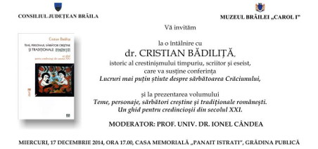 Muzeul Brăilei „Carol I” vă invită miercuri, 17 decembrie 2014, ora 17.00, la Casa Memorială „Panait Istrati”, Grădina Publică, la un eveniment de excepție, în deplin acord cu sărbătorile din această perioadă a anului. Invitat: dr. Cristian Bădiliţă, istoric al creştinismului timpuriu, scriitor şi eseist, autorul volumului "Teme, personaje, sărbători creştine şi tradiţionale româneşti. Un ghid pentru credincioşii din secolul XXI" care va fi prezentat după conferinţa "Lucruri mai puţin ştiute despre sărbătoarea Crăciunului".