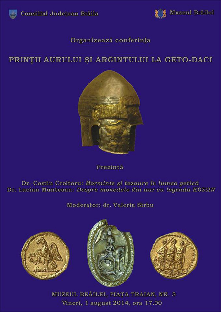 Conferinţa "Prinţii aurului şi argintului la geto-daci" va avea loc vineri, 1 august 2014, ora 17.00, la sediul Muzeului Brăilei (Piaţa Traian nr. 3)