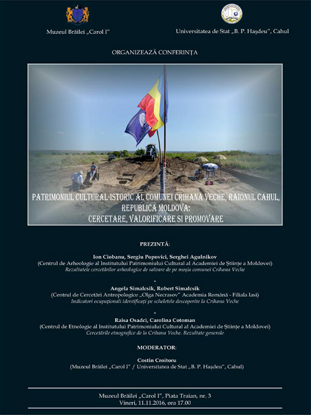 Muzeul Brăilei „Carol I”, în colaborare cu Universitatea de Stat „Bogdan Petriceicu Hașdeu” din Cahul organizează vineri, 11 noiembrie 2016, conferinţa publică cu tema „Patrimoniul cultural-istoric al comunei Crihana Veche, Raionul Cahul, Republica Moldova: cercetare, valorificare și promovare”.