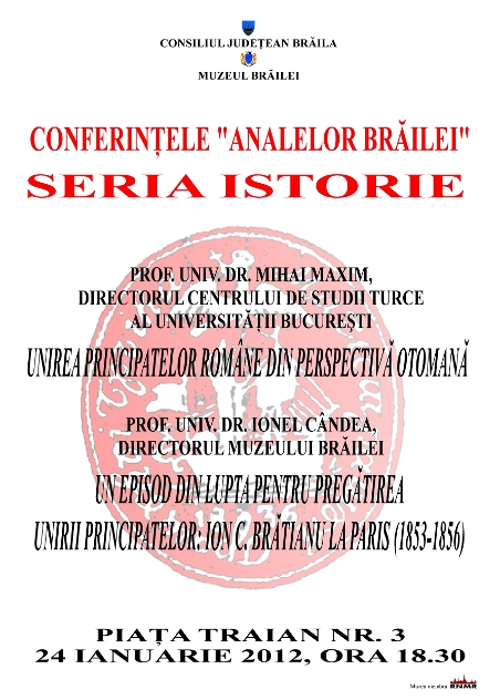 Muzeul Brăilei organizează marţi, 24 ianuarie 2012, ora 18.30, la sediul din Piaţa Traian nr. 3, evenimentul Conferinţele „Analelor Brăilei” – seria Istorie.