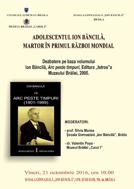 Secția Memoriale a Muzeului Brăilei „Carol I”, în parteneriat cu Școala Gimnazială „Ion Băncilă”, organizează o dezbatere cu tema „Adolescentul Ion Băncilă, martor în Primul Război Mondial”, pe baza volumului „Arc peste timpuri”, de Ion Băncilă, editat la Editura „Istros” a Muzeului Brăilei „Carol I”.