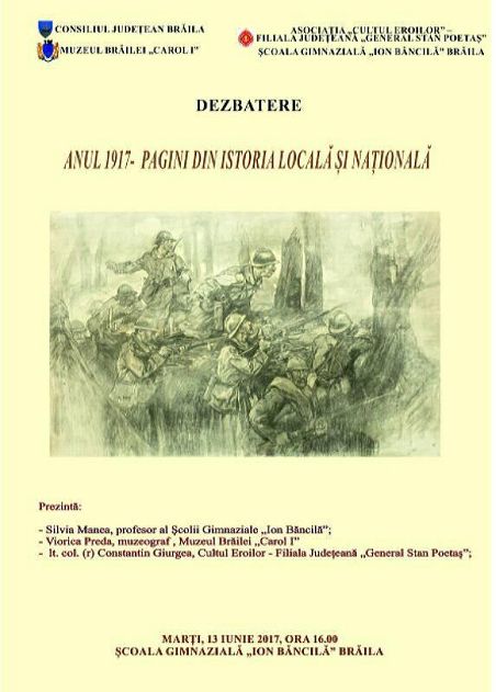 Marți, 13 iunie 2017, ora 16.00, la Școala Gimnazială „Ion Băncilă” Brăila a avut loc dezbaterea cu tema „Anul 1917 - Pagini din istoria locală şi naţională”, activitate organizată de Muzeul Brăilei „Carol I”, în colaborare cu Școala Gimnazială „Ion Băncilă” Brăila și Cultul Eroilor – Filiala Brăila „General Stan Poetaș”.