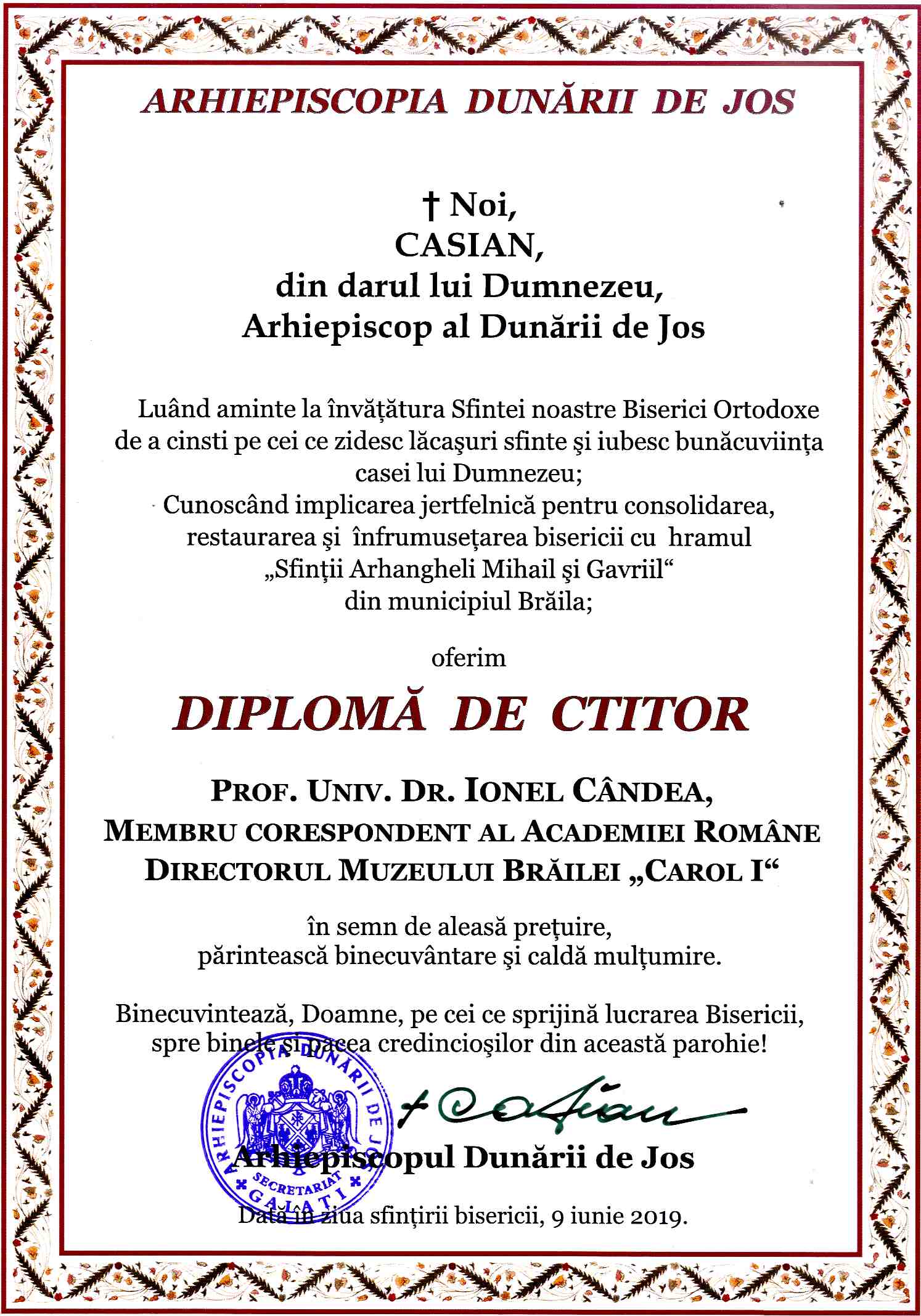 Diplomă de CTITOR, oferită prof. univ. dr. Ionel Cândea, membru corespondent al Academiei Române, managerul Muzeului Brăilei „Carol I", de Arhiepiscopia Dunării de Jos, în ziua sfinţirii Bisericii „Sfinţii Arhangheli Mihail şi Gavriil”, 9 iunie 2019