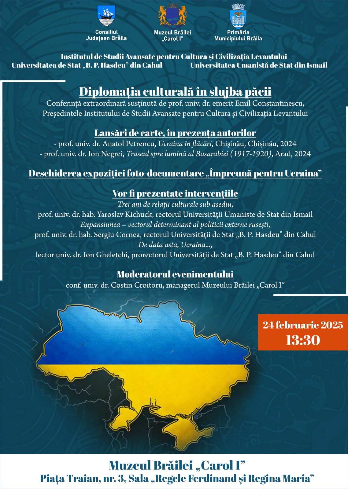 Astăzi, 24 februarie 2025, președintele Consiliului Științific al Institutului de Studii Avansate pentru Cultura și Civilizația Levantului (ISACCL), prof. dr. Emil Constantinescu a fost invitat să participe la o serie de dezbateri, lansări de carte și expoziții organizate de Muzeul „Carol I” al Brăilei în parteneriat cu Universitatea Umanistă de Stat din Ismail, Universitatea de Stat „B. P. Hasdeu” din Cahul și ISACCL pentru a marca trei ani de la invazia Ucrainei de către Federația Rusă.