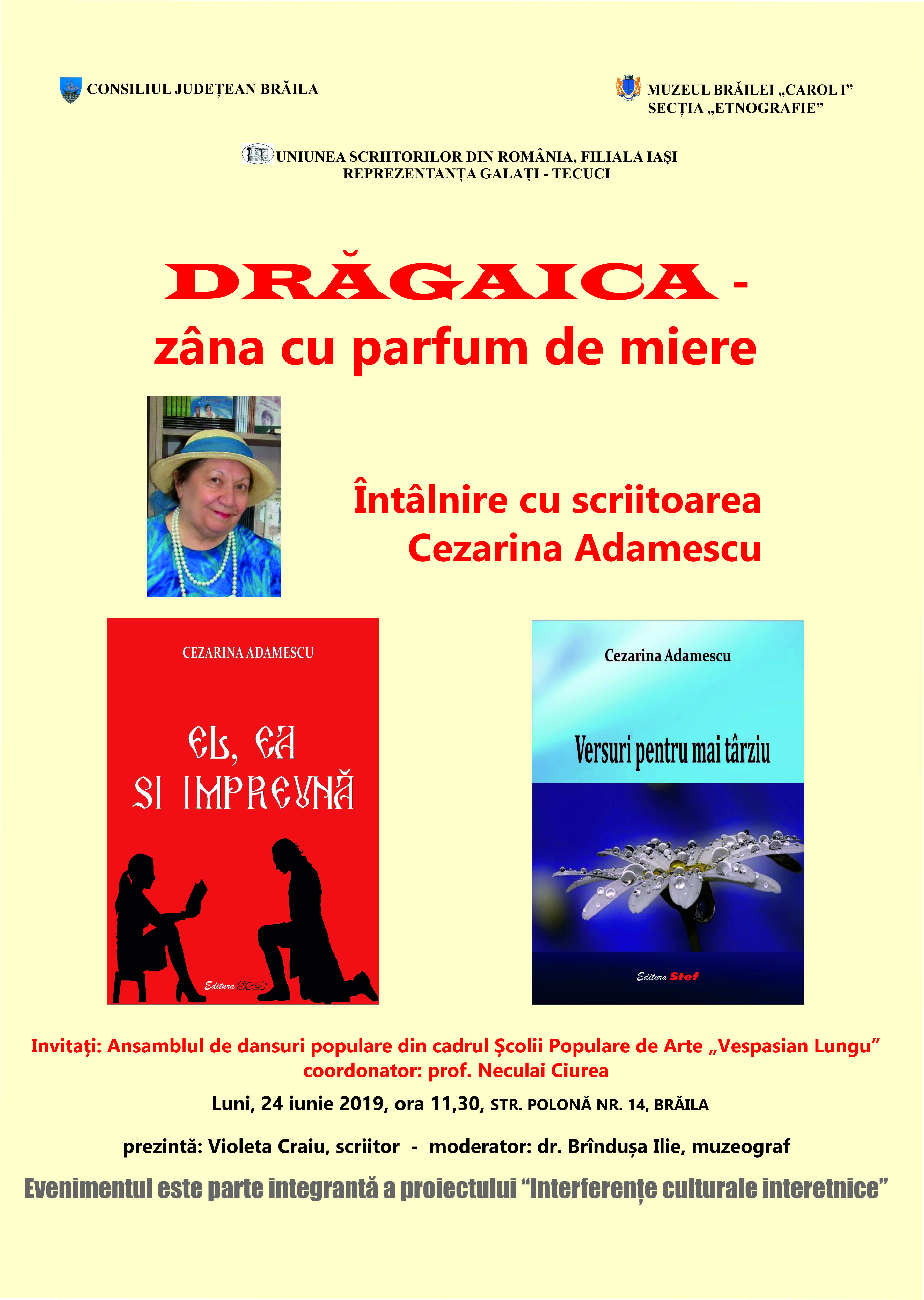 Muzeul Brăilei „Carol I” - Secția Etnografie a organizat luni, 24 iunie 2019, ora 11.30, la sediul din strada Polonă, nr. 14, o activitate cu tema „Drăgaica – zâna cu parfum de miere". Activitatea a fost organizată în colaborare cu Uniunea Scriitorilor din România, Filiala Iași, Reprezentanța Galați-Tecuci și este parte integrantă a proiectului „Interferente culturale interetnice”.