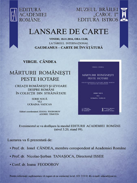 - vineri, 18 noiembrie 2016, ora 12.00: Virgil Cândea, „Mărturii românești peste hotare. Creații românești și izvoare despre români în colecții din străinătate/ Ucraina – Vatican", serie nouă, vol. VI, Editura Academiei Române – Editura Istros a Muzeului Brăilei „Carol I”, Brăila, 2016;