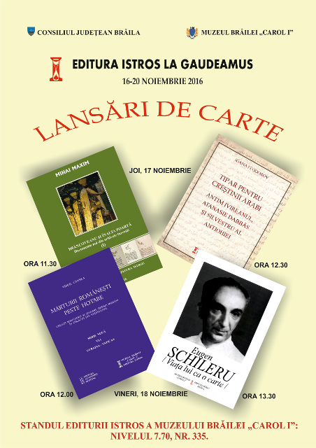 - joi, 17 noiembrie 2016, ora 11.30: Mihai Maxim, „Brâncoveanu și Înalta Poartă/ Documente din arhivele turcești" (I), Editura Istros a Muzeului Brăilei „Carol I”, Brăila, 2016;