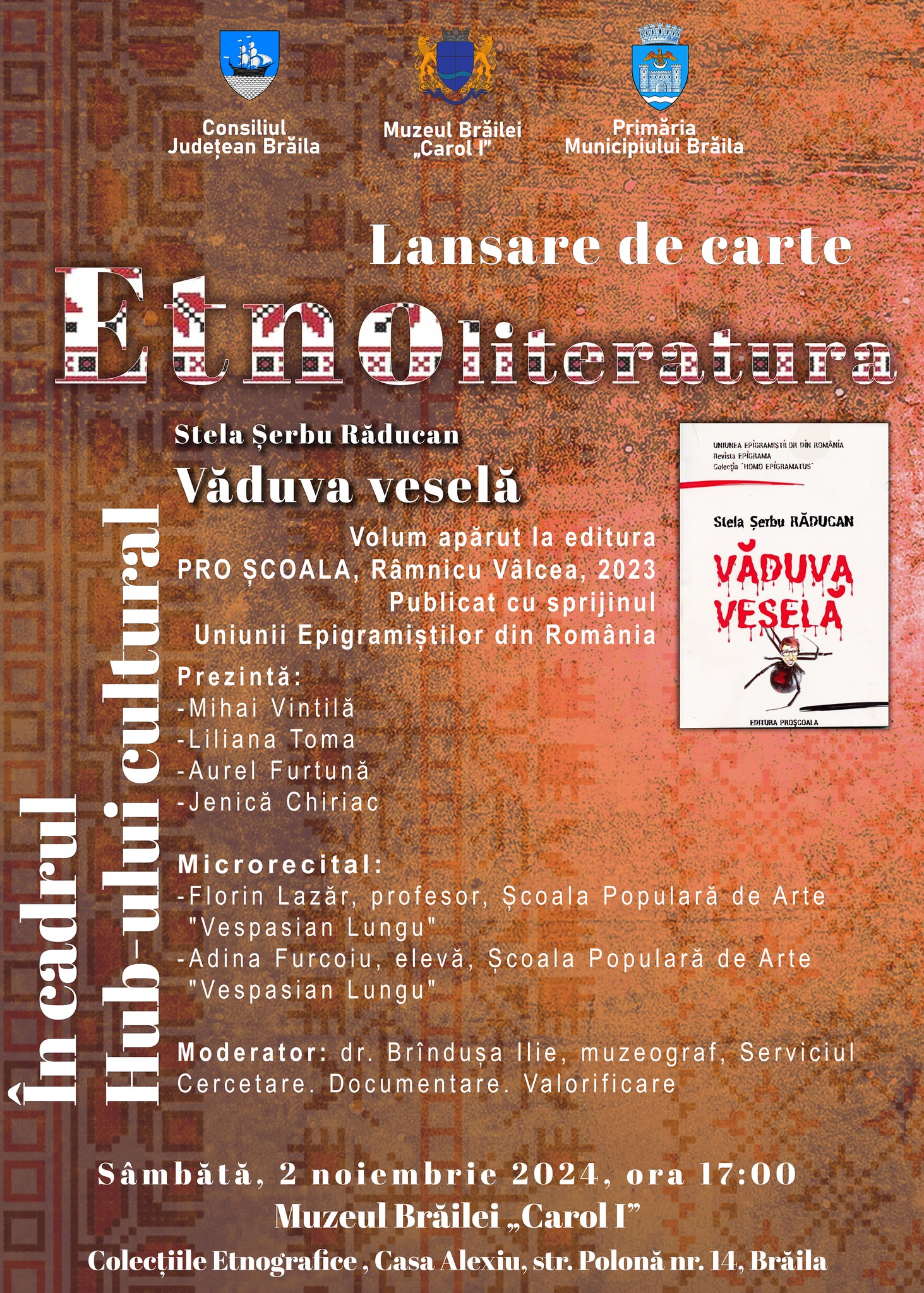 Muzeul Brăilei „Carol I” a organizat sâmbătă, 2 noiembrie, ora 17:00, o nouă întâlnire în cadrul Hub-ului cultural „Etnoliteratura”: lansarea volumului „Văduva veselă”, autor Stela Șerbu Răducan, apărut la Editura PRO ȘCOALA, Râmnicu Vâlcea, 2023, cu sprijinul Uniunii Epigramiștilor din România.