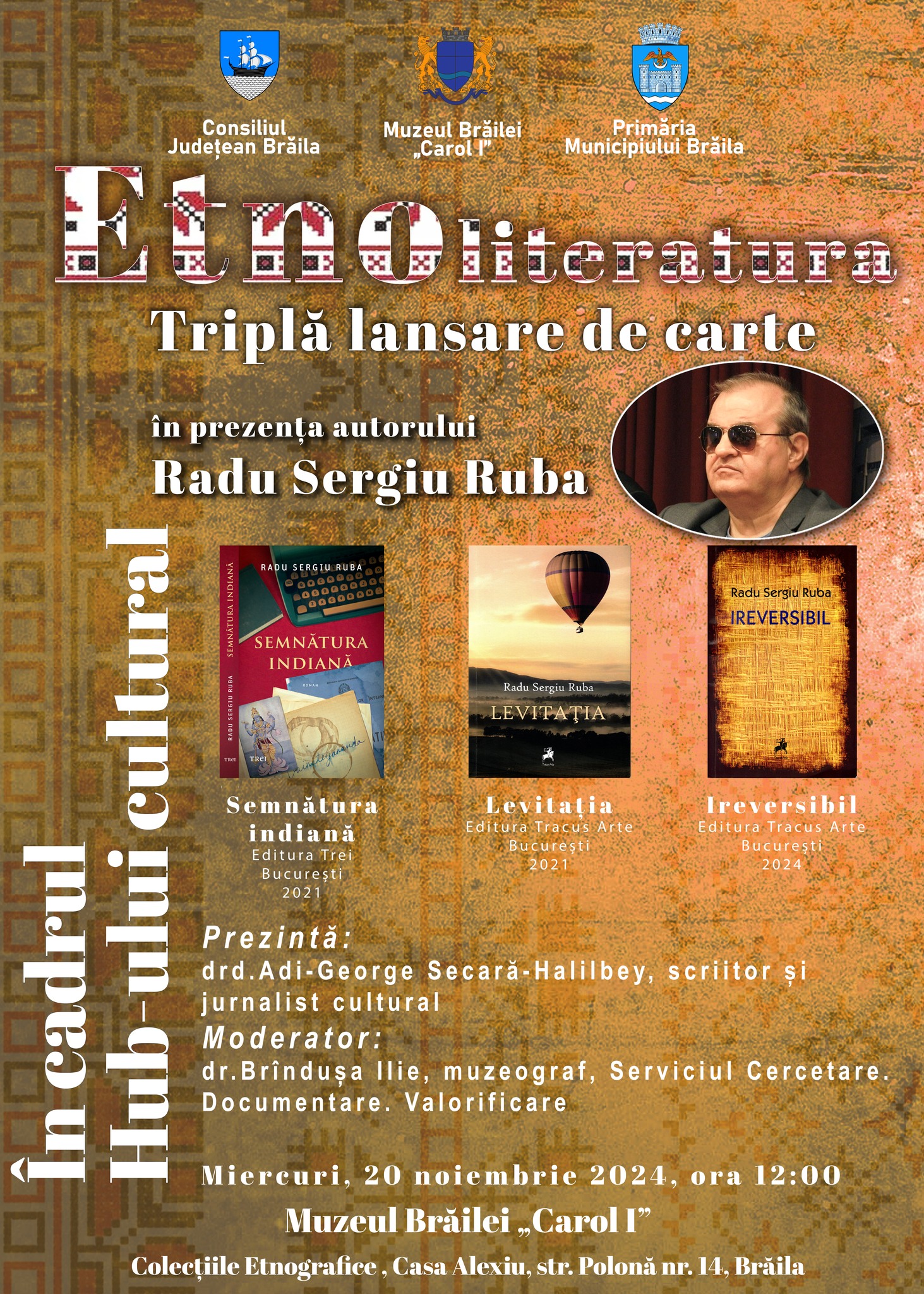 Hub-ul cultural „ETNOLITERATURA”. Triplă lansare de carte: „Semnătura indiană”, „Levitația”, „Ireversibil”, în prezența autorului Radu Sergiu Ruba, la Muzeul Brăilei „Carol I” - Colecțiile Etnografice / Casa Alexiu