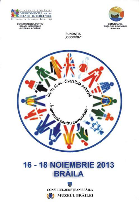 Muzeul Brăilei găzduieşte - sâmbătă, 16 noiembrie 2013, începând cu ora 15.00, la sediul Muzeului Brăilei şi la Centrul Diversităţii Culturale al Muzeului Brăilei - o serie de activităţi organizate în cadrul proiectului "Eu, tu, el, ea - diversitate culturală. Împreună pentru comunitate" derulat de Fundaţia "Obscina" Brăila, în parteneriat cu Guvernul României - Departamentul pentru Relaţii Interetnice şi Comunitatea Ruşilor Lipoveni din România - filiala Brăila. La manifestările organizate la Brăila, în perioada 16-18 noiembrie 2013, participă invitaţi din Republica Moldova, Sarichioi, Tulcea, Borduşani, Fălticeni, precum şi membrii celorlalte comunităţi etnice din Brăila.