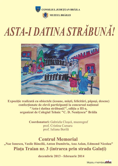 Expoziție realizată cu obiecte - icoane, măști, păpuși, desene - confecționate de elevii participanți la Concursul Național "Asta-i datina străbună", ediția a III-a, organizat de Colegiul Tehnic "C. D. Nenițescu" Brăila.