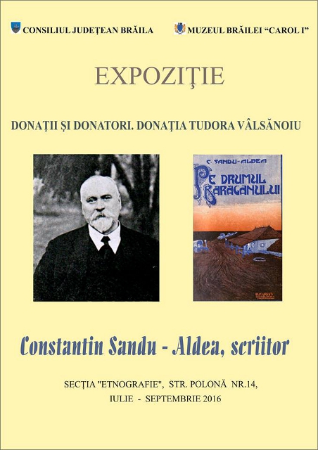 Expoziţia Constantin Sandu-Aldea, scriitor cuprinde volumele apărute între 1908-1920 la Editurile "Minerva", "Răsăritul" şi Editura Librăriei “Pavel Suru”, intrate în patrimoniul muzeului prin donaţia Tudora Vâlsănoiu. Donatoarea (s-a născut în localitatea Tichileşti) se înrudeşte pe linie maternă cu Constantin Sandu –Aldea. Pe lângă cărţile prezentate în expoziţie, donaţia mai cuprinde o serie de obiecte casnice şi de artă populară provenind din lăzile de zestre ale familiei. Constantin Sandu-Aldea (n. 14 noiembrie 1874, Tichileşti, Brăila – d. 21 martie 1927, Bucureşti) reprezintă o personalitate marcantă a ştiinţei şi culturii româneşti. A fost agronom, profesor, scriitor, traducător. Ca agronom este fondatorul ştiinţei ameliorării plantelor în România. A studiat la Paris şi Berlin. În 1919 a devenit membru corespondent al Academiei. În literatură s-a afirmat ca autor de nuvele. Personajele lui sunt naturi ancenstrale, alese din lumea Bălţilor Dunării şi a Bărăganului. Coordonator expoziție: Gabriela Cloșcă, șef Secția Etnografie.
