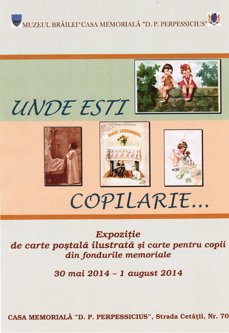 Cei mici şi cei mari sunt aşteptaţi să descopere o altă reprezentare a copilăriei, în expoziţia "Unde eşti copilărie...", deschisă la Muzeul Brăilei - Casa Memorială "Dumitru Panaitescu Perpessicius" (str. Cetăţii nr. 70). Vă aşteptăm să descoperiţi piesele de cartofilie şi tipăriturile expuse, toate din fondurile "Memoriale" ale Muzeului Brăilei - motiv de desfătare a ochiului şi, în acelaşi timp, o sursă de cunoaştere a istoriei cărţii poştale ilustrate cu tema "copilul şi copilăria" -, precum şi câteva din cărţile pentru copii, semnate de autori renumiţi şi ilustrate de ilustratori importanţi.