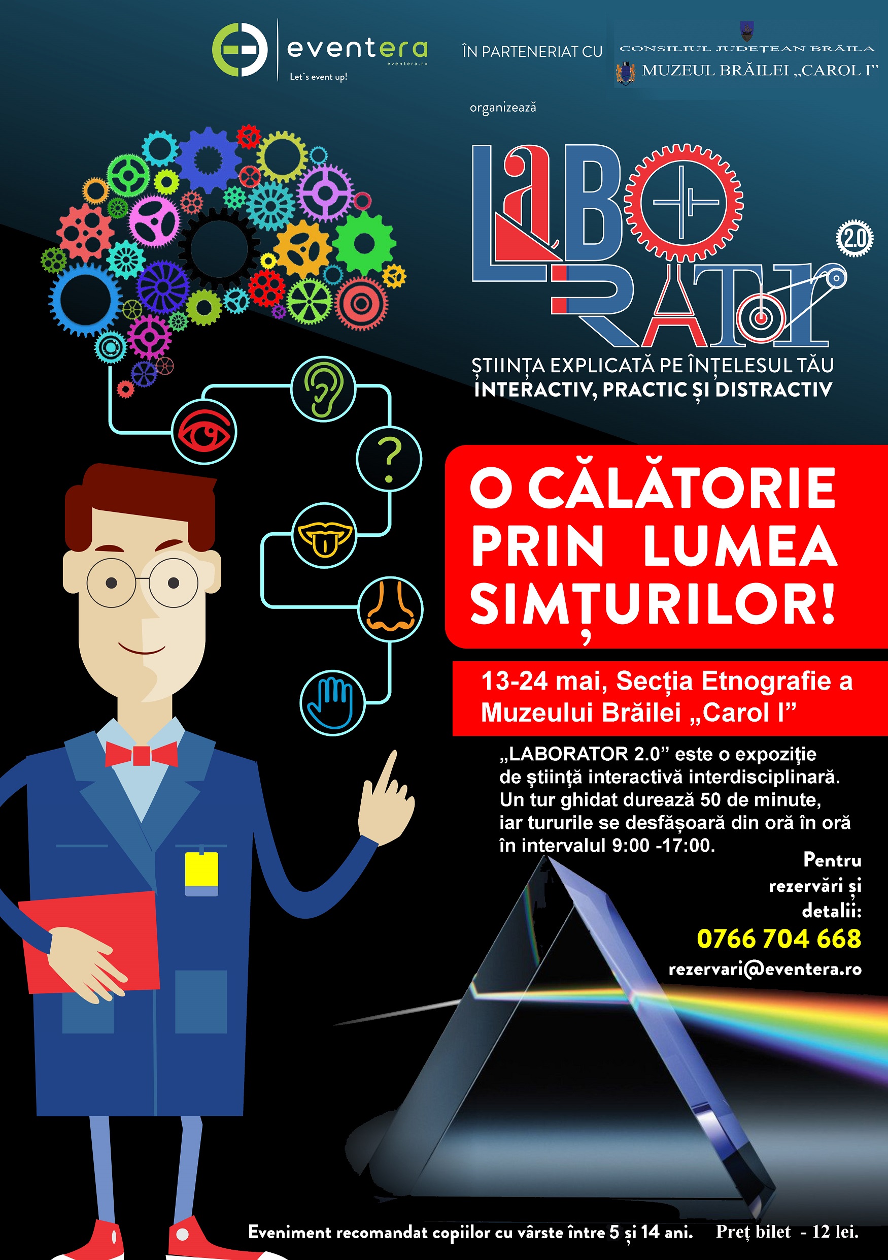 Eventera și Muzeul Brăilei „Carol I” vă invită în perioada 13-24 mai într-o călătorie prin lumea simțurilor în „Laborator 2.0”. Expoziția este adresată copiilor cu vârste între 5 și 14 ani și își propune să le ofere acestora o experiență educațională nonformală care să le deschidă simțurile pentru știință.