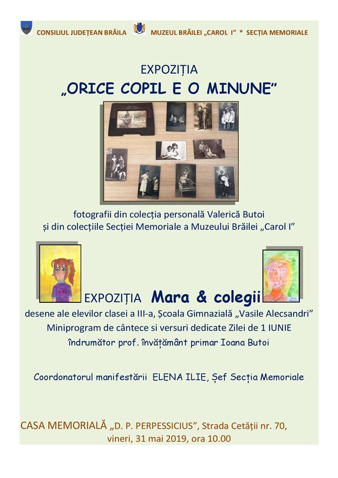 Expoziţiile temporare „ORICE COPIL E O MINUNE”, fotografii din colecţia personală Valerică Butoi şi din colecţiile Secţiei Memoriale şi „MARA & COLEGII”, desene ale elevilor clasei a III-a, Şcoala Gimnazială „Vasile Alecsandri”, la Muzeul Brăilei „Carol I” - Casa Memorială „Dumitru Panaitescu Perpessicius”