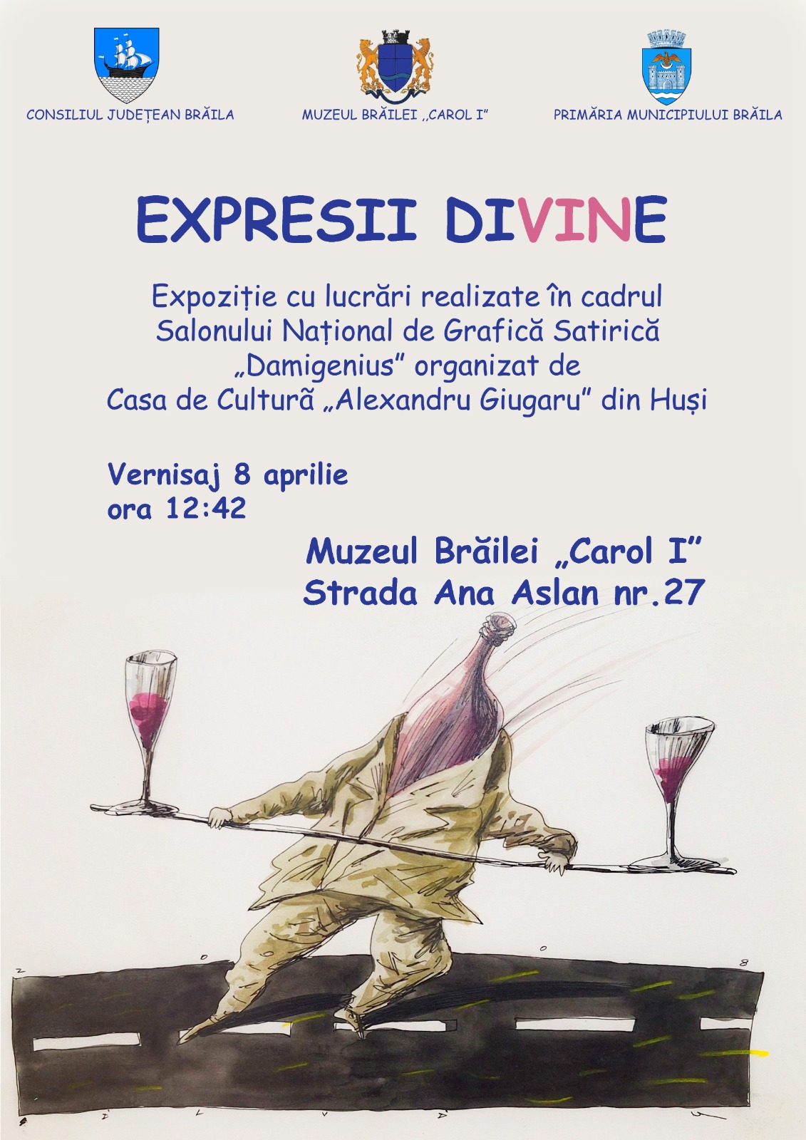 „Expresii diVINe”, una dintre cele trei expoziții al căror vernisaj a avut loc ieri, aduce pe simezele Secției Artă a Muzeului Brăilei „Carol I” lucrări care au participat la edițiile trecute ale Salonului de Grafică Satirică „Damigenius” de la Huși, al cărui inițiator și director artistic a fost din anul 1989 ilustrul caricaturist și realizator de filme de animație Cristian Marcu (1959-2012).