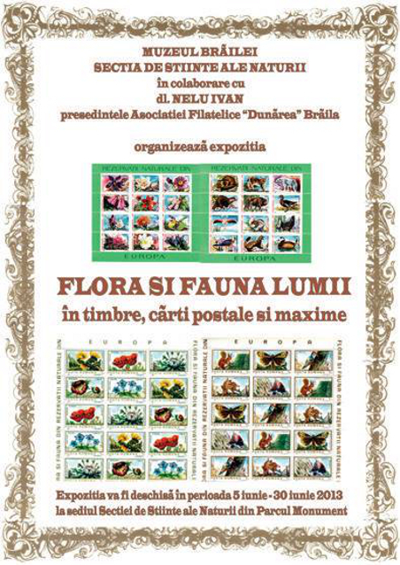 Cu ocazia ZILEI MEDIULUI, Secția Științele Naturii a Muzeului Brăilei (Aleea Parcului nr. 1 - Parcul Monument) a vernisat - miercuri, 5 iunie 2013, ora 11.00 - expoziția FLORA ȘI FAUNA LUMII ÎN TIMBRE, CĂRȚI POȘTALE ȘI MAXIME, realizată în colaborare cu dl. Nelu Ivan, președintele Clubului Filatelic „Dunărea” Brăila.