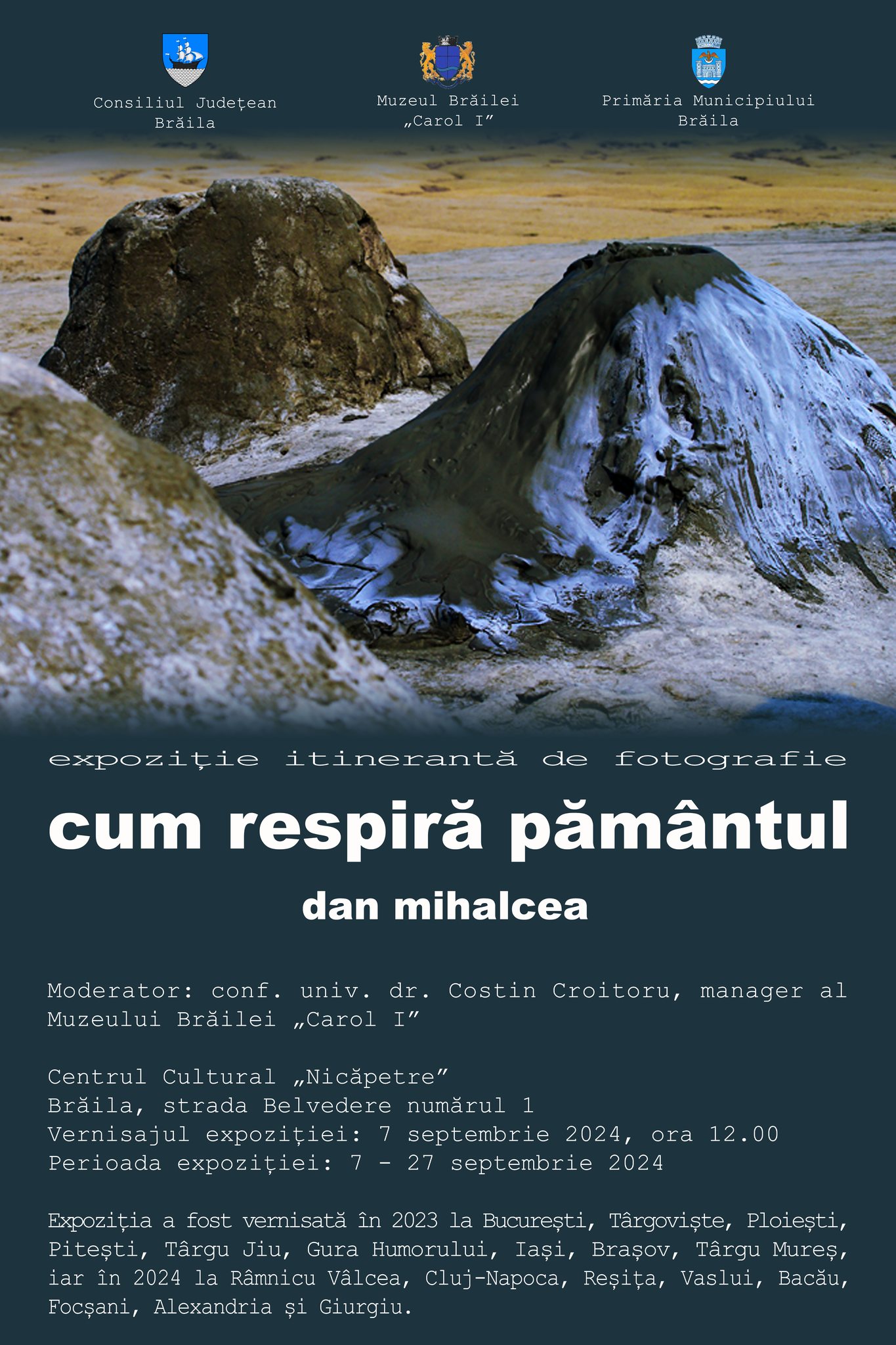 Expoziția personală itinerantă de fotografie „Cum respiră pământul” a regizorului Dan Mihalcea va fi vernisată la Muzeul Brăilei „Carol I” - Centrul Cultural Nicăpetre, în data de 7 septembrie 2024, la ora 12.00. Expoziția este deschisă publicului în perioada 7 - 27 septembrie 2024.