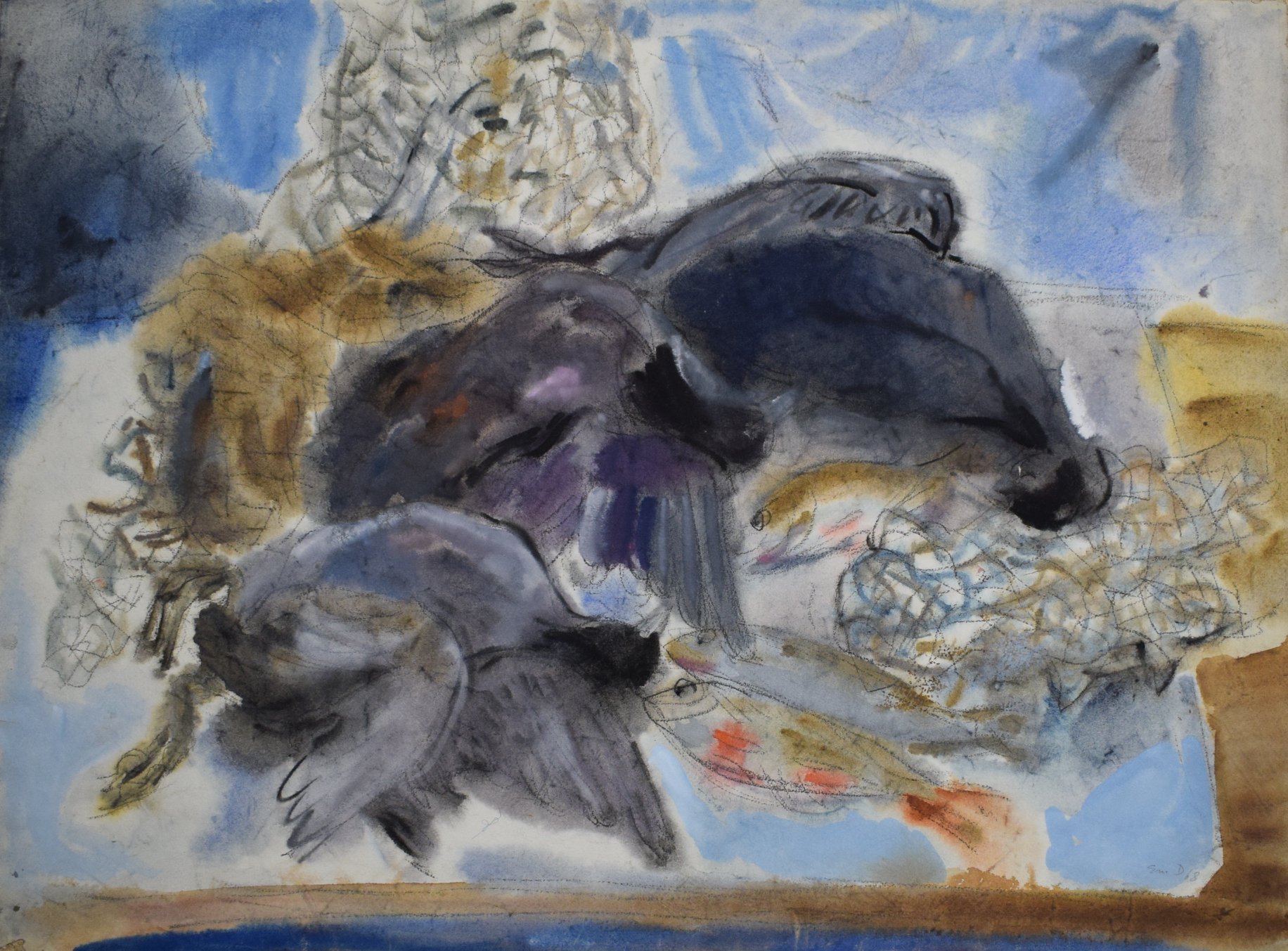 Emilia Dumitrescu | „Vânat” | 1968 | cărbune și acuarelă pe hârtie | Muzeul Brăilei „Carol I”.