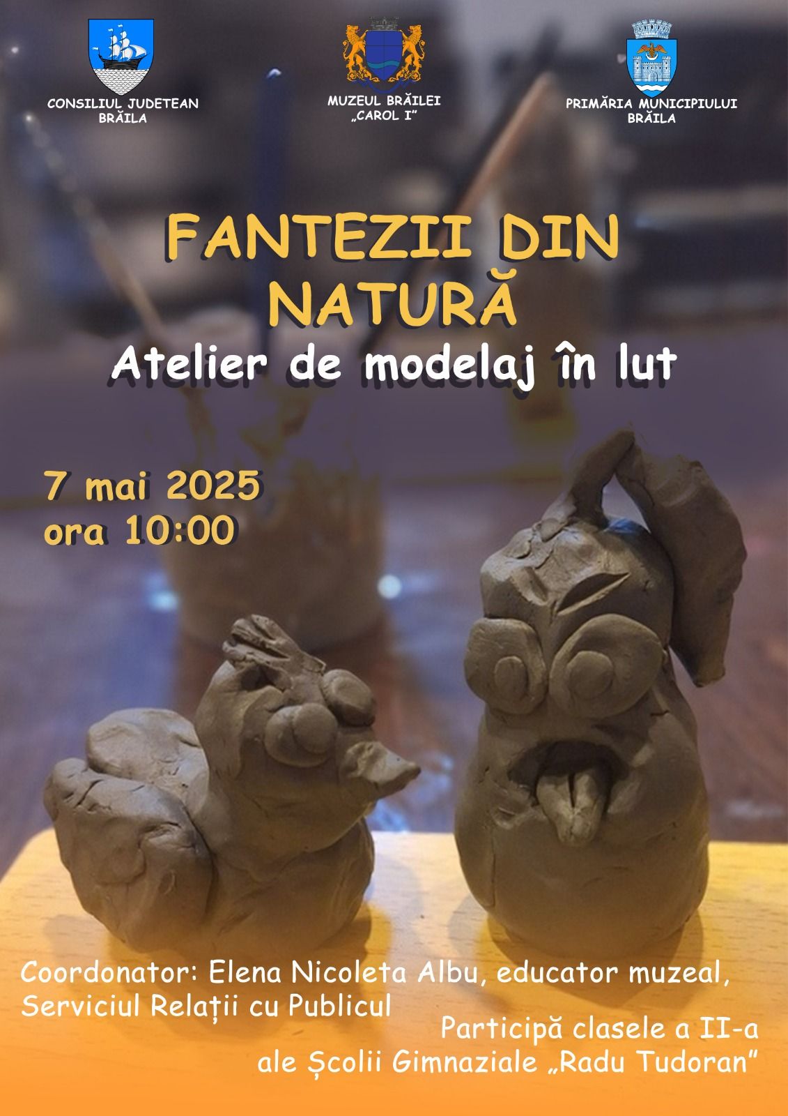 Atelierul „Fantezii din natură”, organizat de Elena Nicoleta Albu, educator muzeal la Serviciul Relații cu Publicul al Muzeului Brăilei „Carol I”, a fost o adevărată aventură a imaginației și a creativității pentru elevii claselor a II-a ale Școlii Gimnaziale „Radu Tudoran”, susținuți de doamnele Mihaela Cociașu și Victorița Vîlcu, profesori învățământ primar. În cadrul acestui atelier de modelaj în lut micii artiști au avut ocazia să transforme elemente din natură - flori, frunze, fructe-în personaje cu trăsături umane, pline de viață.