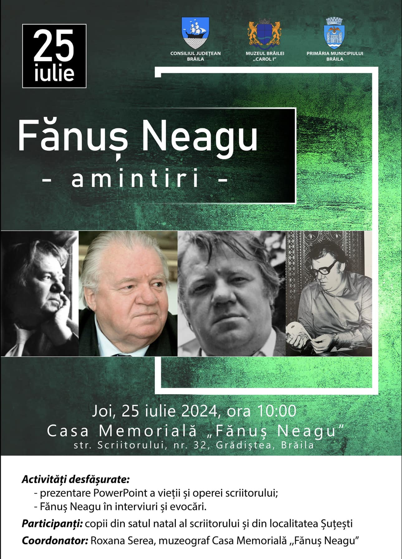 „Fănuș Neagu - amintiri” - joi, 25 iulie 2024, ora 10.00, la Muzeul Brăilei „Carol I” - Casa Memorială „Fănuș Neagu” (str. Scriitorilor nr. 32, Grădiștea, jud. Brăila)