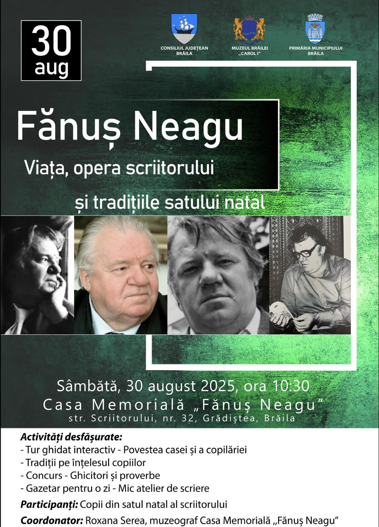 „FĂNUȘ NEAGU - VIAȚA, OPERA SCRIITORULUI ȘI TRADIȚIILE SATULUI NATAL”, la Muzeul Brăilei „Carol I” - Casa Memorială „Fănuș Neagu”