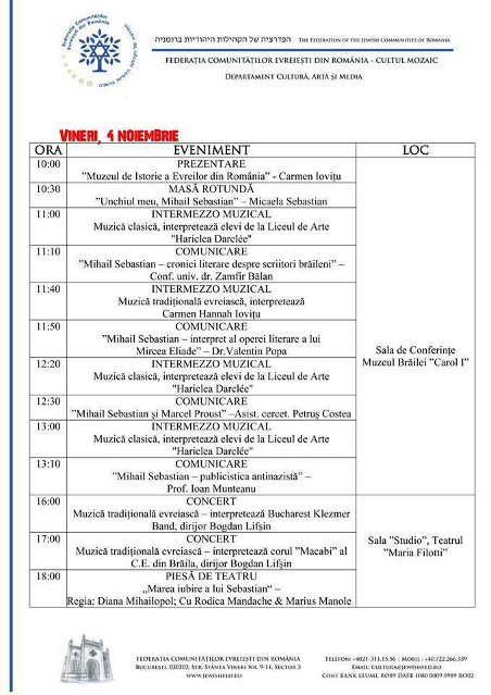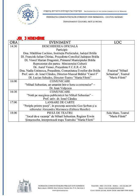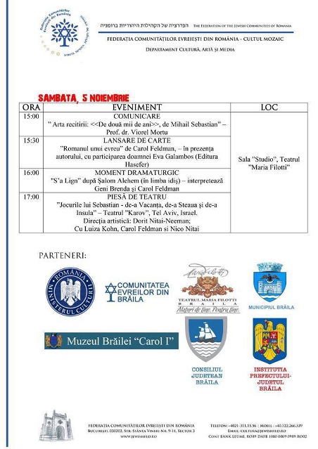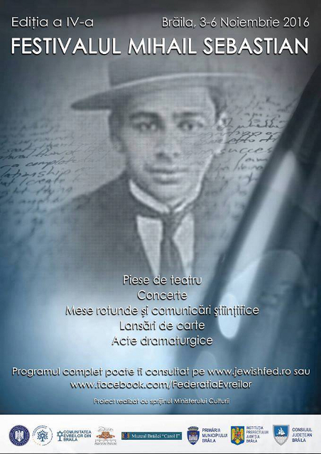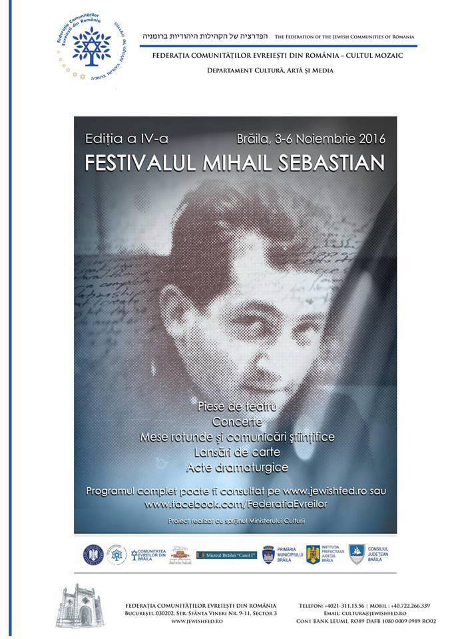 Federația Comunităților Evreiești din România – Cultul Mozaic (F.C.E.R. – C.M.) organizează la Brăila, în perioada 3-5 noiembrie, FESTIVALUL „MIHAIL SEBASTIAN”.