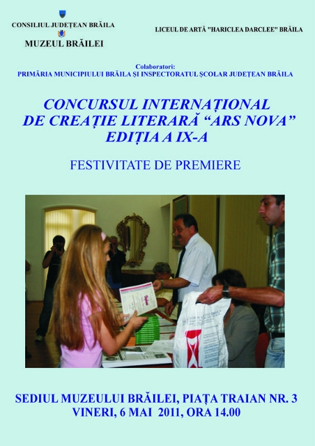Vă aşteptăm la festivitatea de premiere a elevilor participanţi la Concursul Internaţional de Creaţie Literară „Ars Nova”, ediţia a IX-a, organizat de Liceul de Artă „Hariclea Darcleé” Brăila, în colaborare cu Inspectoratul Şcolar Judeţean Brăila, Primăria municipiului Brăila şi Muzeul Brăilei. Festivitatea va avea loc vineri, 6 mai, ora 14.00, la sediul Muzeului Brăilei (Piaţa Traian 3), după vernisajul expoziţiei itinerante "Patrimoniu 2010" - realizată de Muzeul Viticulturii şi Pomiculturii Goleşti, judeţul Argeş.