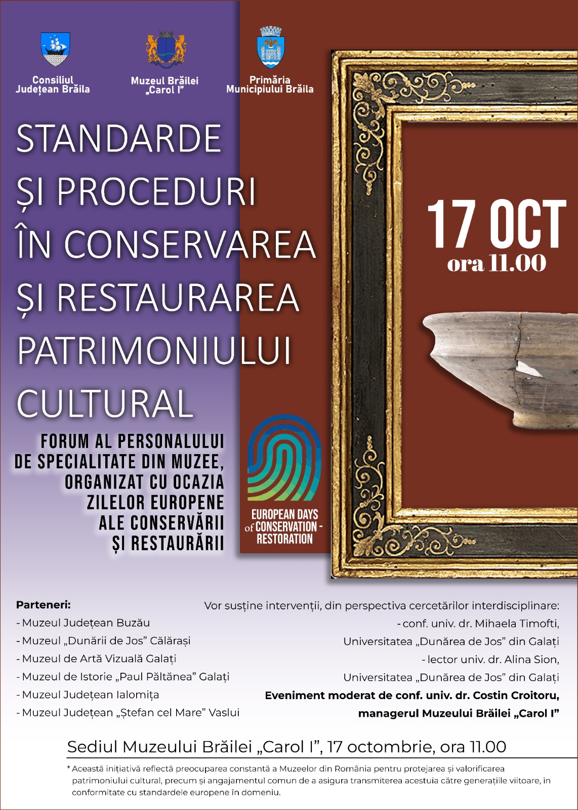 Muzeul Brăilei „Carol I” găzduiește vineri, 17 octombrie, la ora 11.00 evenimentul „Standarde și Proceduri în Conservarea și Restaurarea Patrimoniului Cultural” - Forum al personalului de specialitate din Muzee, organizat cu ocazia Zilelor Europene ale Conservării și Restaurării.