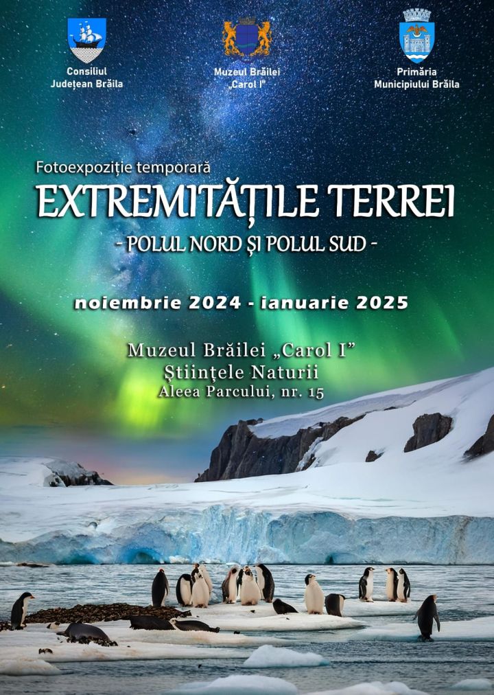 În perioada noiembrie 2024 – ianuarie 2025 vă invităm la Muzeul Brăilei „Carol I” - clădirea Științele Naturii (Aleea Parcului, nr. 15), pentru a vizita fotoexpoziția documentară „Extremitățile Terrei. Polul Nord și Polul Sud”.