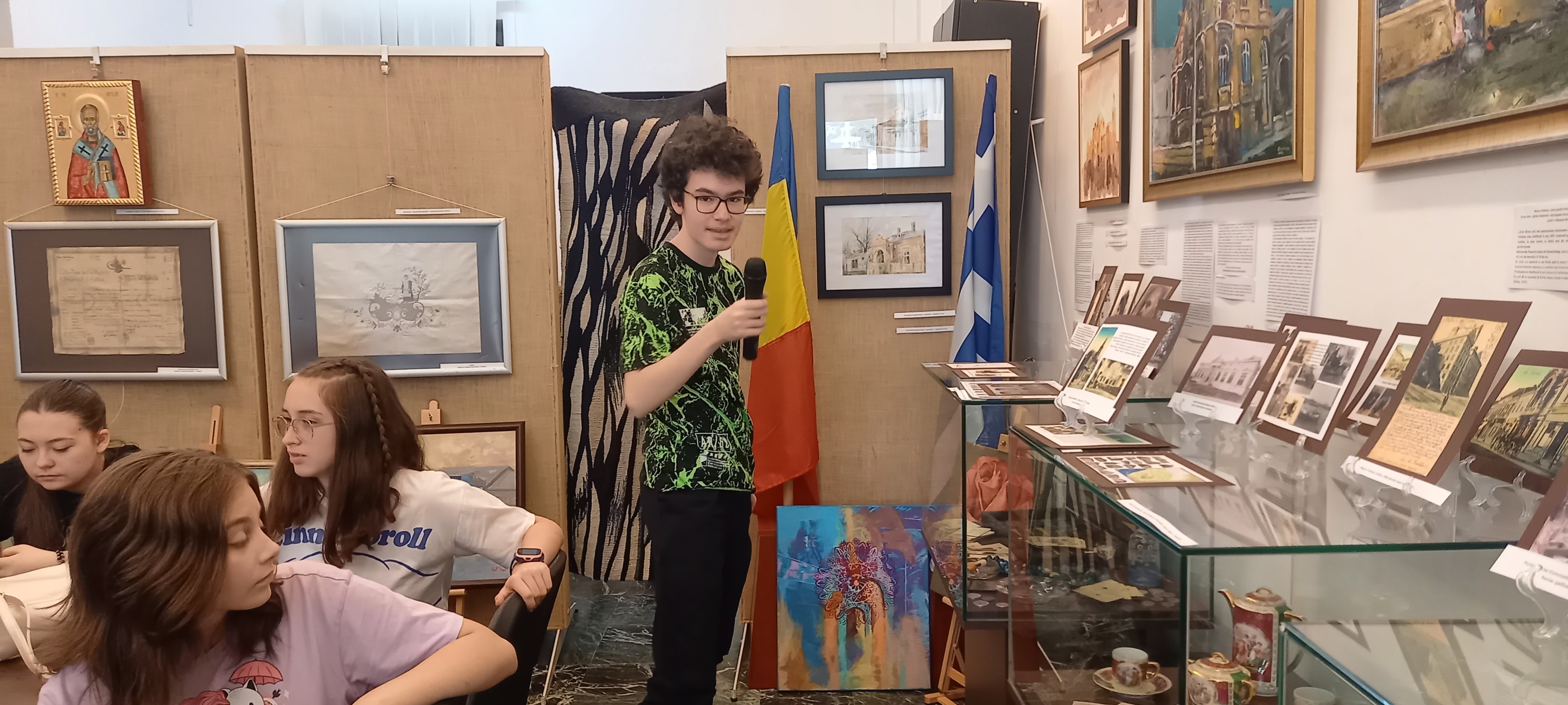 Camelia Hristian, șef Serviciul Relații cu Publicul a prezentat expoziția temporară deschisă cu ocazia Zilei Naționale a Greciei: OBIECTE din sec. XIX de la Biserica Buna Vestire „Greacă” Brăila și din scrinul cu amintiri de la familii membre ale Comunității Elene Brăila: Florentina Cristina Mușat, Beatrice Dobrescu, Mihai Feraru, Veronica Macri, Jana Andreescu, Elena Salomeea Kaloxilos Moraru, Marilena Ioanid | ICOANE, PICTURĂ, TAPISERIE semnate de artiştii plastici (din Brăila, Brașov, București, Galați, Tulcea): Jana Andreescu, Gheorghe Andreescu, Marilena Ioanid, Cristina Ionescu Berechet, Irina Ionescu Berechet, Elena Salomeea Kaloxilos Moraru, Mioara Mitu, Gheorghe Mosorescu, Elena Orbocea, Iulia Pastorcici, Dennis Teodorescu, Marius Teodorescu, Traian Tsamuris | Fotoexpoziție „CĂLĂTORIE PE DUNĂRE ȘI ÎN DIASPORA GREACĂ DIN ORAȘELE DUNĂRENE, DE LA IZVOARE LA VĂRSARE” | Mini-expoziție cu lucrări de pictură semnate de Nela Constantinescu, membră a Asociației „Hristo Botev” a Bulgarilor din Brăila și Paul Petrov, membru al Comunității Rușilor Lipoveni Brăila.