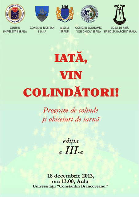 Universitatea „Constantin Brâncoveanu” - Centrul Universitar Brăila, în colaborare cu Muzeul Brăilei, Liceul de Artă „Hariclea Darclée” Brăila şi Colegiul Economic „Ion Ghica” Brăila organizează o manifestare dedicată sărbătorilor de iarnă intitulată "Iată, vin colindători!". Evenimentul va avea loc miercuri, 18 decembrie 2013, ora 13.00, la sediul din Brăila al Universităţii „Constantin Brâncoveanu” (strada Rubinelor, nr. 16-18).