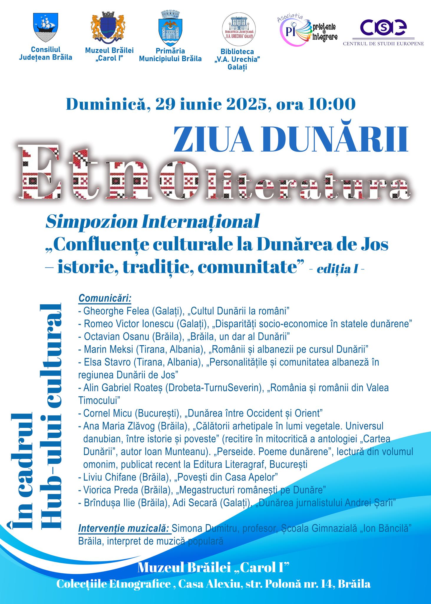 Muzeul Brăilei „Carol I” - Casa Colecțiilor Etnografice, alături de Centrul de Studii Europene din cadrul Facultății de Litere, Universitatea din București, Biblioteca „V.A.Urechia” Galați și Asociația „Prietenie & Integrare” Galați organizează dumincă, 29 iunie, începând cu ora 10:00, la sediul din str. Polonă, nr. 14, ediția I a Simpozionului Internațional „Confluențe culturale la Dunărea de Jos – istorie, tradiție, comunitate” dedicat Zilei Dunării.