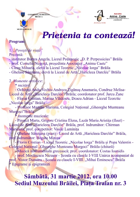 Muzeul Brăilei, în colaborare cu Asociaţia non-guvernamentală şi non-profit "Anima Caste" Brăila, organizează sâmbătă, 31 martie 2012, ora 10.00, o întâlnire ce are ca motto „Prietenia ta contează!” şi este dedicată persoanelor care, la un moment dat, ne-au schimbat viaţa.