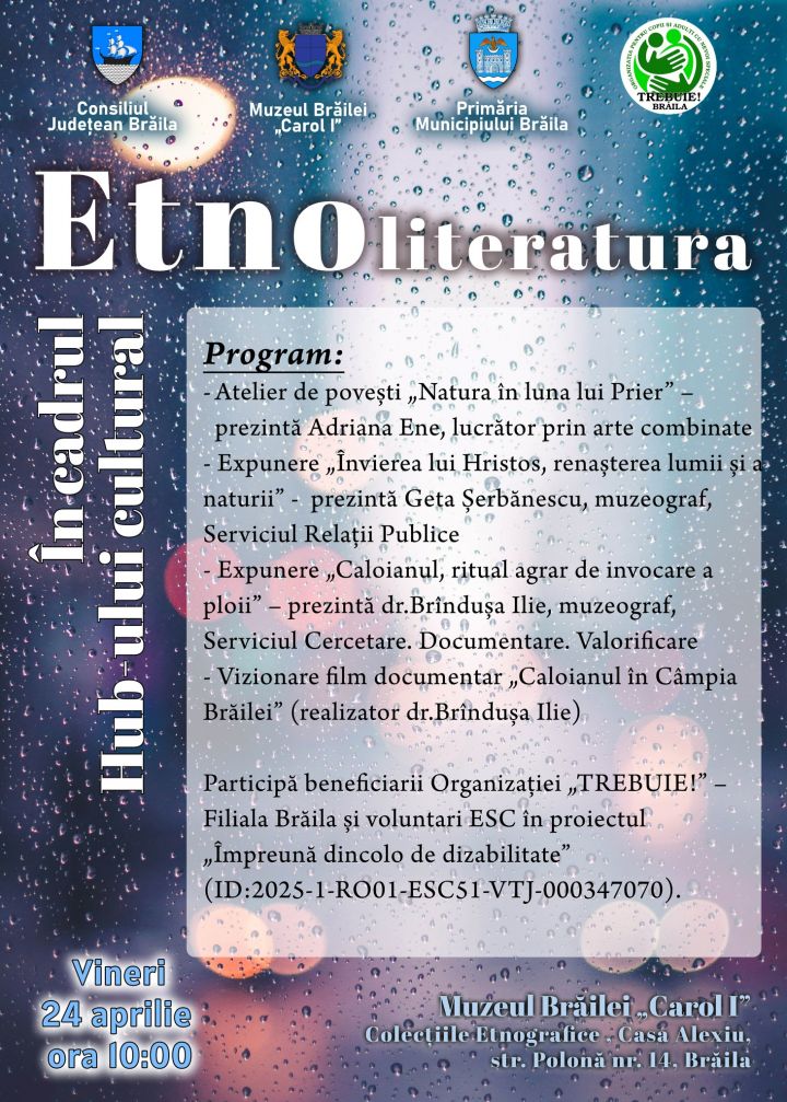 Muzeul Brăilei „Carol I” - Casa Colecțiilor Etnografice, împreună cu Organizația „Trebuie!”– Filiala Brăila organizează vineri, 24 aprilie, începând cu ora 10:00, o nouă întâlnire în cadrul Hub-ului cultural „Etnoliteratura”, la Casa Alexiu (str.Polonă nr.14).