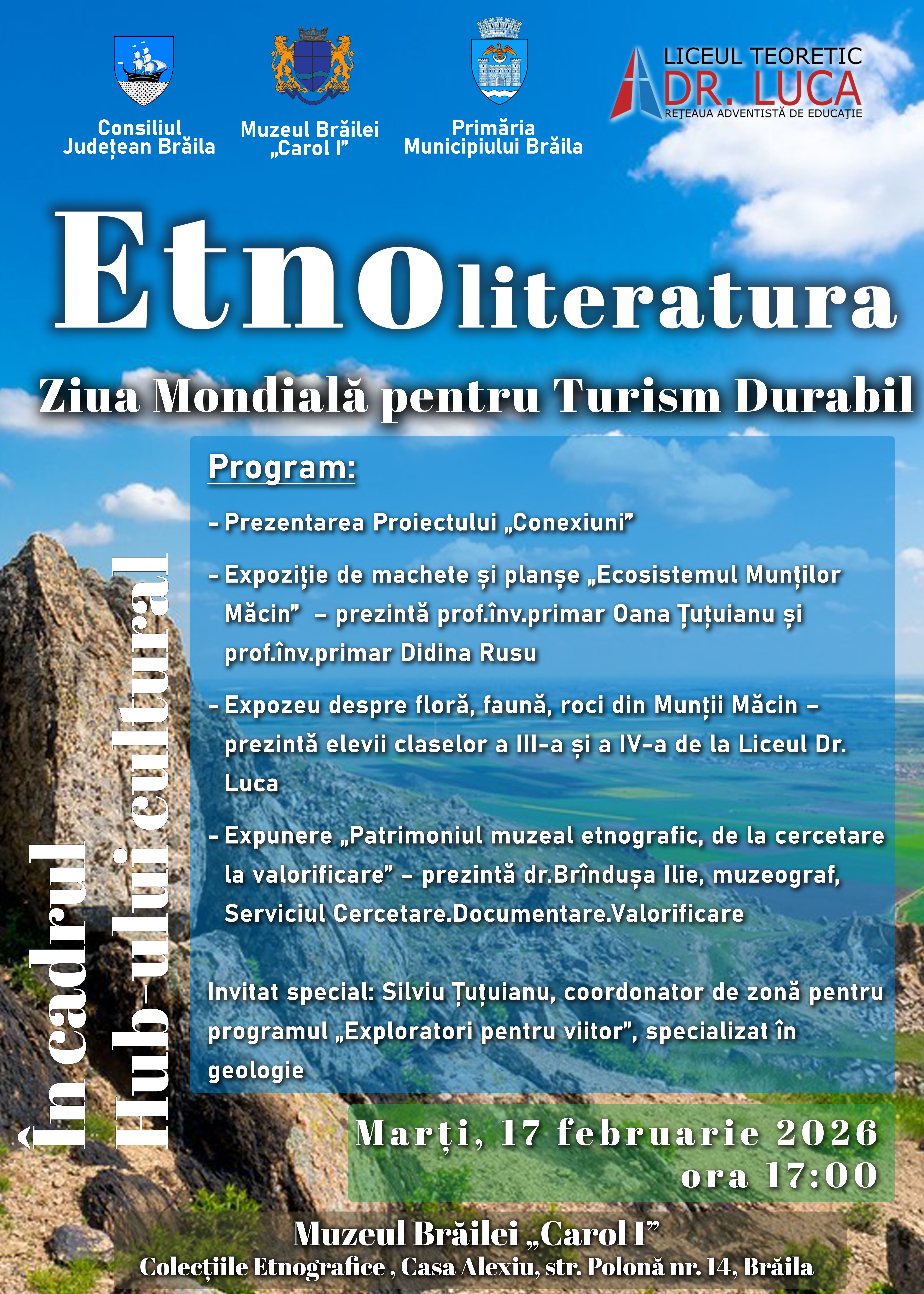 De Ziua Mondială pentru Turism Durabil (17 februarie), Muzeul Brăilei „Carol I”- Casa Colecțiilor Etnografice organizează, alături de Liceul Dr.Luca din Brăila, o nouă întâlnire în cadrul Hub-ului cultural „Etnoliteratura” la Casa Alexiu, str. Polonă, nr.14, începând cu ora 17:00.