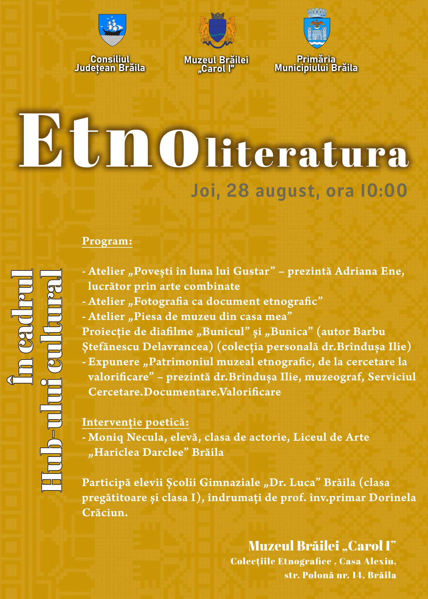 Muzeul Brăilei „Carol I”- Casa Colecțiilor Etnografice organizează joi, 28 august, începând cu ora 10:00, o nouă întâlnire în cadrul Hub-ului cultural „Etnoliteratura”, la sediul din str. Polonă, nr.14.