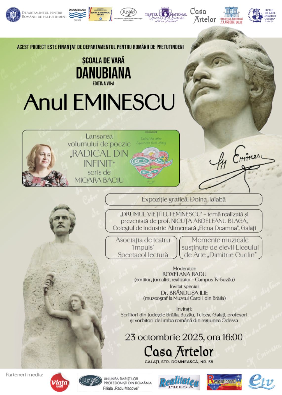„În „Anul Eminescu", motiv de bucurie și prilej de întâlnirejoi, 23 octombrie orele 16:00, cu ocazia lansării volumului meu de poezii „Radical din infinit", în cadrul ediției a VII a a Școlii de vară „Danubiana". Proiect finanțat de către Departamentul Românilor de Pretutindeni și organizat, în cele mai mici detalii, de către Asociaţia Danubiana Galaţi!