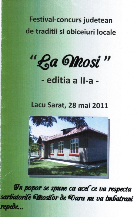 Şcoala Lacu Sărat a găzduit, pe 28 mai 2011, a doua ediţie a festivalului-concurs de tradiţii şi obiceiuri populare "La Moşi", structurat pe două secţiuni: Muzical-coregrafică şi Obiecte realizate de elevi. Au participat şcolile: "George Coşbuc", "Anton Pann", "I.L. Caragiale", "Ion Băncilă", Tichileşti, Galbenu, Cireşu, Lanurile. Marele Premiu a fost câştigat de "George Coşbuc", cu "Căluşul de Rusalii", îndrumător învăţătoarea Florica Panţuru. Pe locul I, la egalitate de puncte, s-au situat formaţiile Şcolilor Tichileşti şi "Anton Pann", cu obiceiul "Paparude". Pe locul al II-lea s-a clasat Şcoala Galbenu cu "Regina balului". Locul al III-lea a fost ocupat de şcolile din Cireşu cu "Drăgaica" şi Lanurile cu "Paparude". Menţiuni au primit Şcoala "Ion Băncilă" cu prezentarea "De la Pluguşor la Sorcova" şi "I.L. Caragiale " cu "Capra".