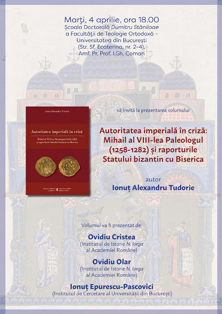 Lansarea cărţii „Autoritatea imperială în criză: Mihail al VIII-lea Paleologul (1258-1282) şi raporturile Statului bizantin cu Biserica", autor: Ionuţ Alexandru Tudorie, apărută la Editura „Istros" a Muzeului Brăilei „Carol I" va avea loc marţi, 4 aprilie 2017, ora 18.00, la Şcoala Doctorală „Dumitru Stăniloae" a Facultăţii de Teologie Ortodoxă - Universitatea din Bucureşti.